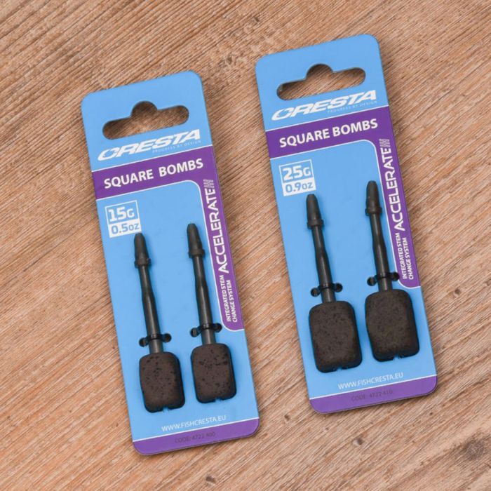 Cresta Accelerate Square Bombs, aerodynamic bomb setups with stems interchangeable with the Accelerate range. Manufactured from an alloy blend that makes for a reduced impact as they enter the water. With a square shape and rounded profile they're designed to hold in place on underwater slopes while offering the minimum of resistance.