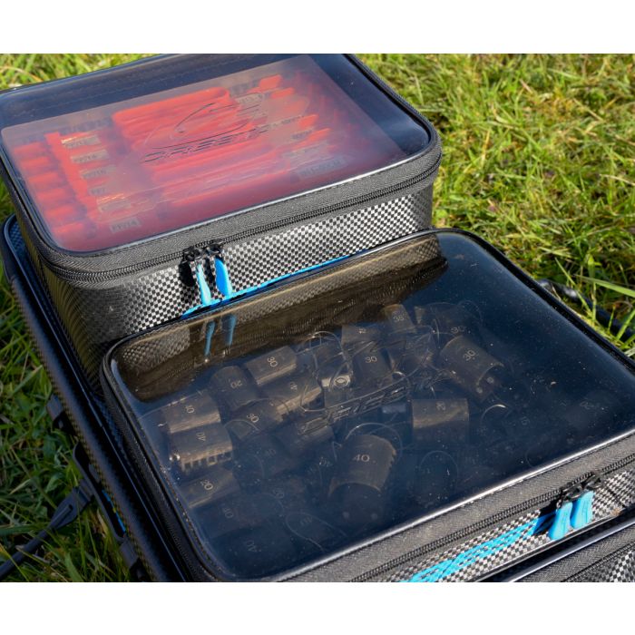 This waterproof EVA Accessory Bag Large Low offers space for numerous accessories, such as feeder, rigs, reels and other tackle, including the Cresta Modular hooklength system. Thanks to the clear lid the contents is directly visible when lid is zipped closed.