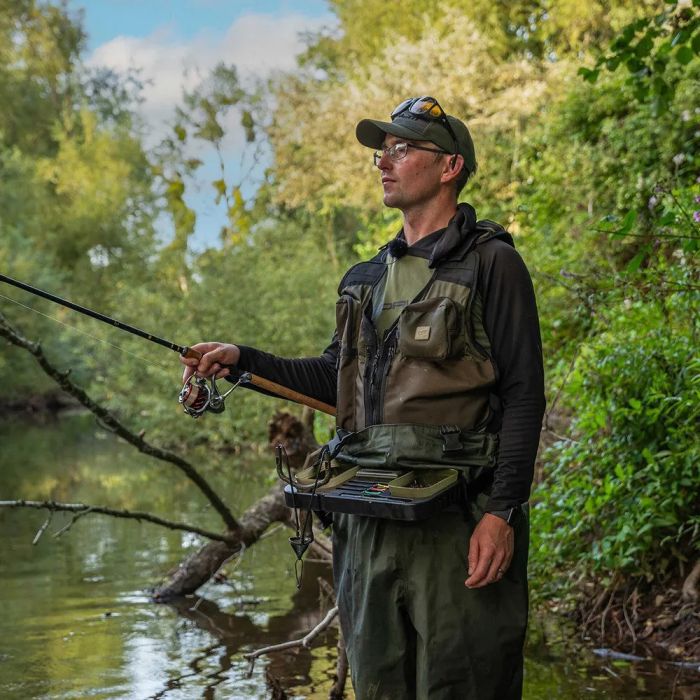 The Korum Glide Trotting Tray is a cleverly thought-out tray that can be either worn as a waist belt or used freestanding on a bank stick or tripod to provide a superb tackle and fishing bait station where you keep all your essentials close to hand. Perfect, when coarse fishing on the move either trotting a float down a river, or when specialist fishing for carp and barbel when stalking.