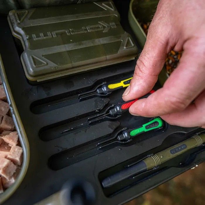 Korum have specifically designed this chair to carry everything you need for a fishing session with specific slots that will house 1pt bait tubs securely. There is also a Korum Bits Blox which fits into its own slot which is perfect for smaller terminal tackle items such as hooks and swivels. The Korum Glide Trotting tray is also supplied with a range of fishing tools to cover everything you will need for a session including baiting needles and disgorgers. For situations where the swim you are fishing is out of throwing range for feeding, there is also a slot for carrying a catapult. Finished in black, the Korum Glide Trotting Tray is the perfect accessory for the mobile angler and is a must have addition to your fishing tackle collection.