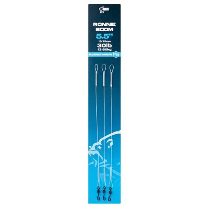 Nash Fluorocarbon Ronnie Rig Boom, Anti-tangle, extra tough Fluorocarbon stiff booms for perfect Ronnie Rig presentation, kicking the hookbait away from the end tackle for optimum hooking over any lake bed. A Ronnie swivel allows fast changes of hooks using Tungsten Kickers without knots or shrink tube.