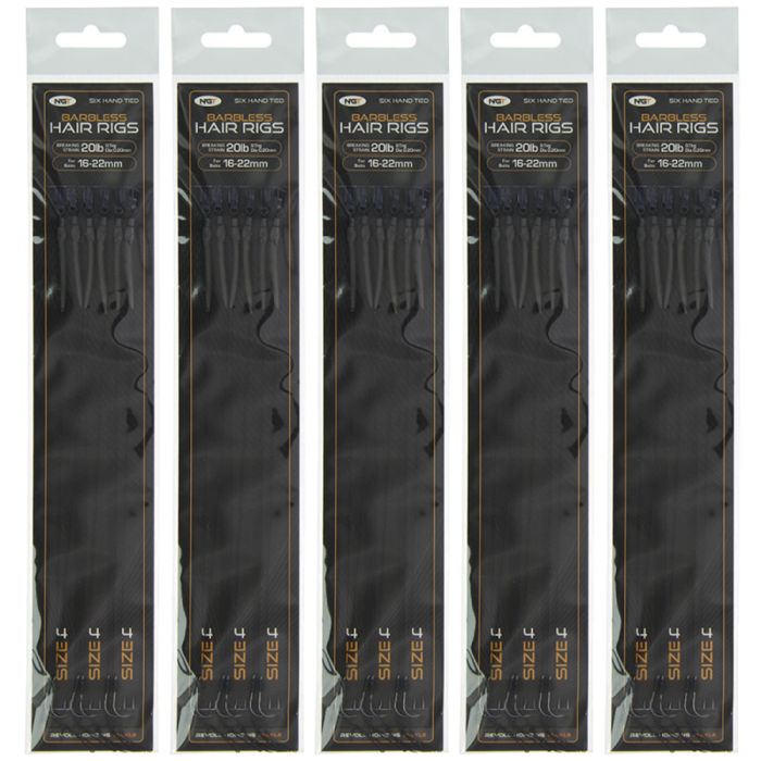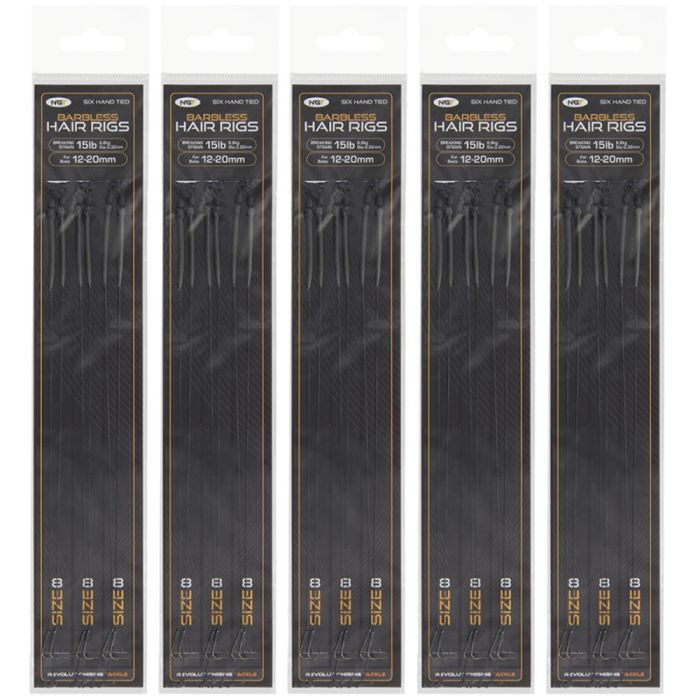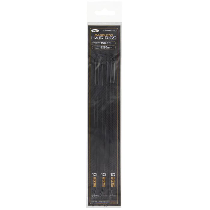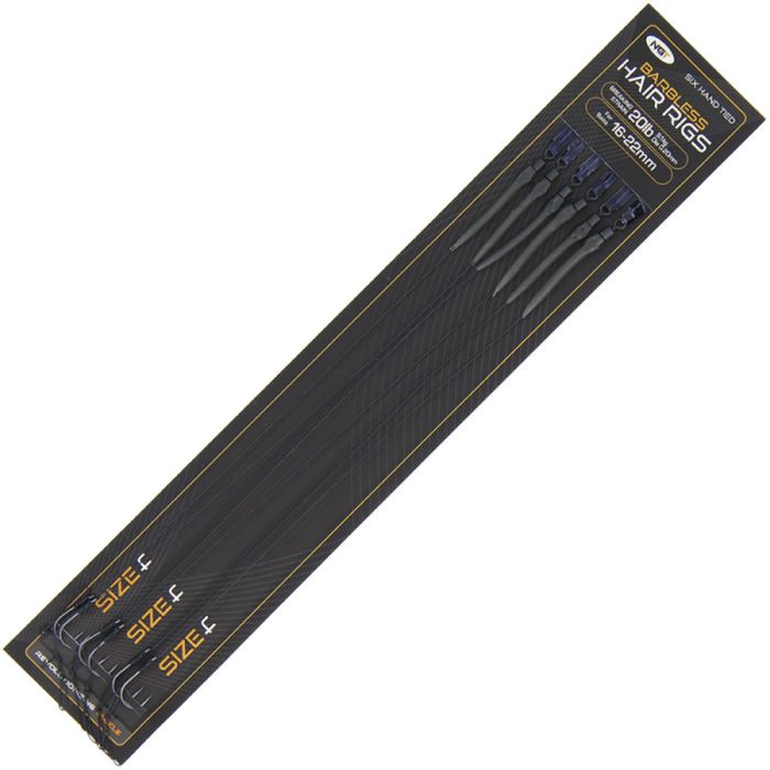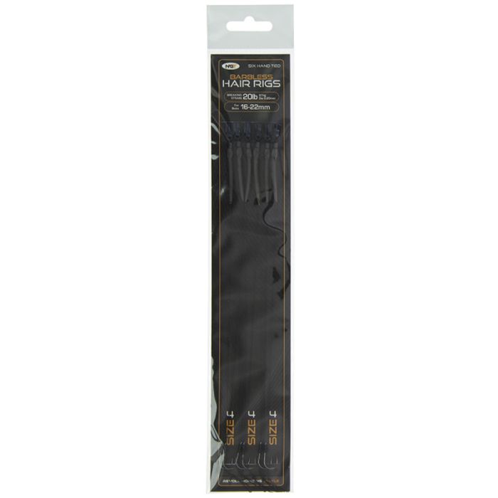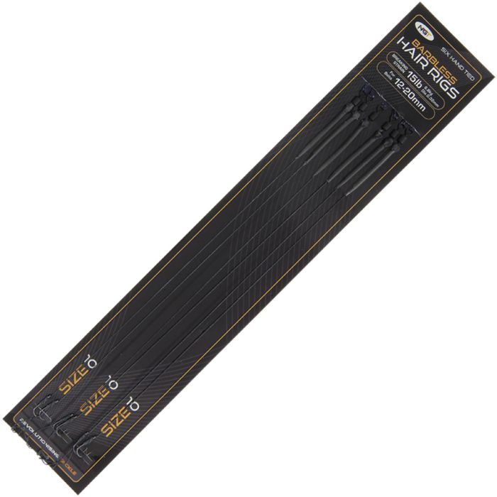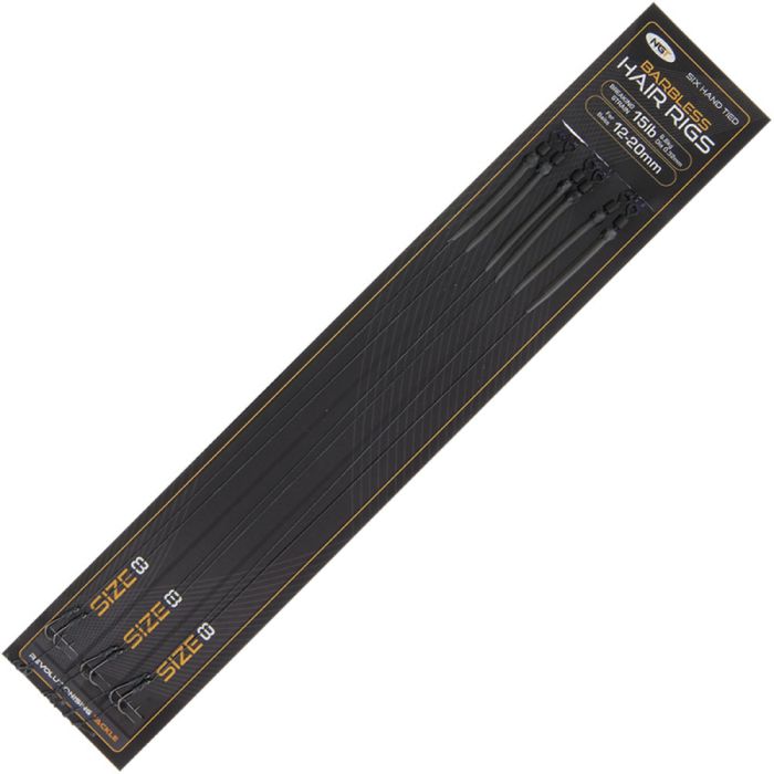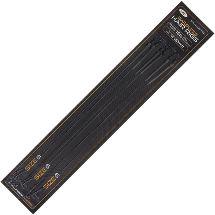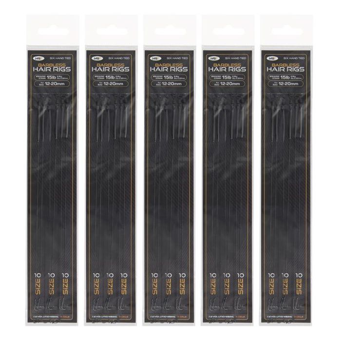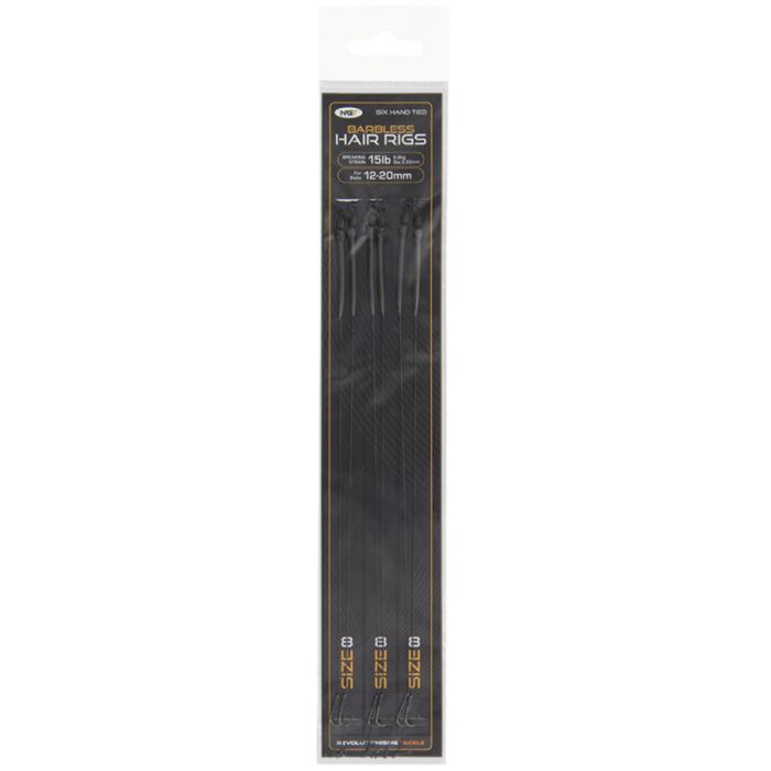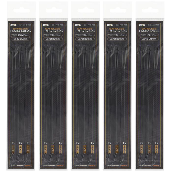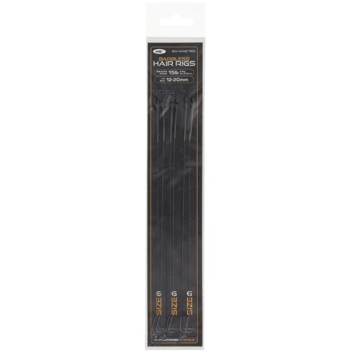 Six pack hand tied hair rigs. Now with improved 'slimline' packaging, better hooks, swivels and with shrink tube. These will accommodate 12-20mm baits and are tied to 15lb braid.