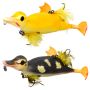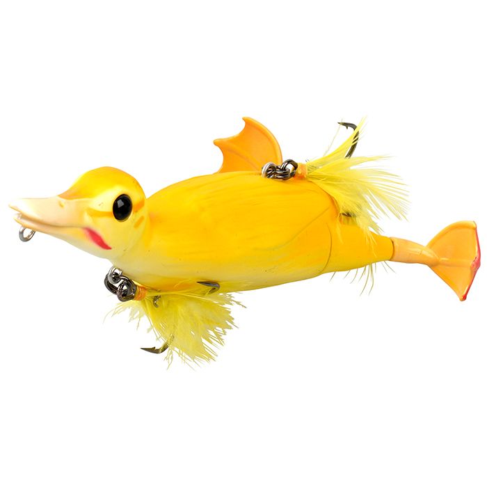 A super realistic Duckling top water imitation lure loaded with innovative features! The 3D Scanned details will fool even the most wary predator fish and ensure you brutal attacks! Hard ABS ultra-strong body with semi soft and durable feet. The spinning feet give the lure an incredible lively, splashing action, leaving a great bubble trail and wake calling in the predator fish from distance. For open water fishing, 2 feathered covered treble hooks, one on the chest and one on the back, clipped to the body, ensures a good hookup rate. For fishing in snaggy conditions, remove the treble on the belly, the lure is designed, so it always lands on the belly with the exposed treble hook on the back. 2 styles of action, attach the line to the Beak, and the lure will run with a low discrete posture, like a duckling trying to hide and escape at the same time. Attach the line to the chest and the lure will run higher, with a more panic fleeing action. The lure can be fished fast or slow, with steady retrieve, long pulls, and mimics a duckling in the most realistic way! Superb lure for Pike, Bass, Musky and big brutal Catfish! It is said that a great top water strike, counts for 10 regular hits – tie on the Suicide Duck and find out!