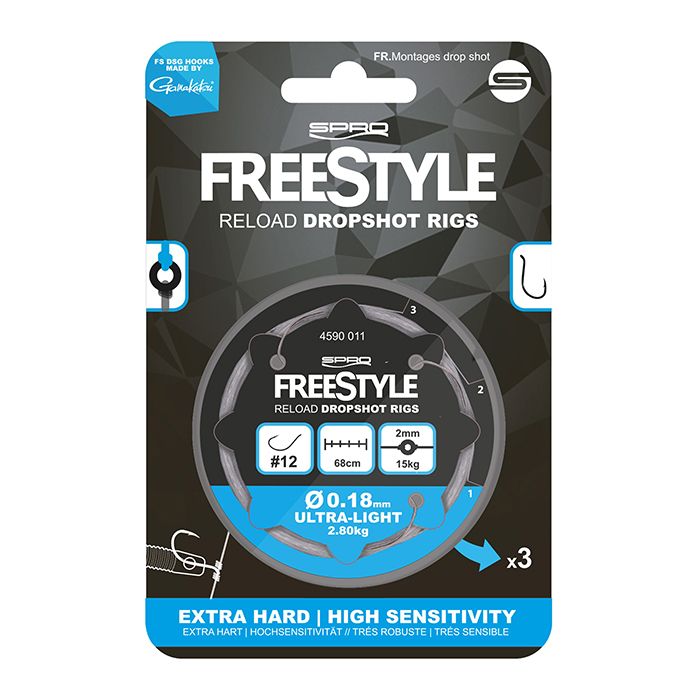 Spro Freestyle Reload Dropshot Rigs, Pre-rigged dropshot rigs featuring our Gamakatsu DSG hooks. Simply tie the connection ring to braided line and add an FS Pear Sinker at the required depth. Quick and easy!